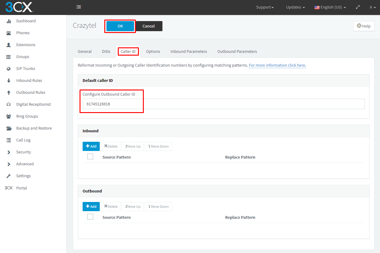 4. On the Caller ID tab you can Configure Outbound Caller ID. Click OK to save the details.