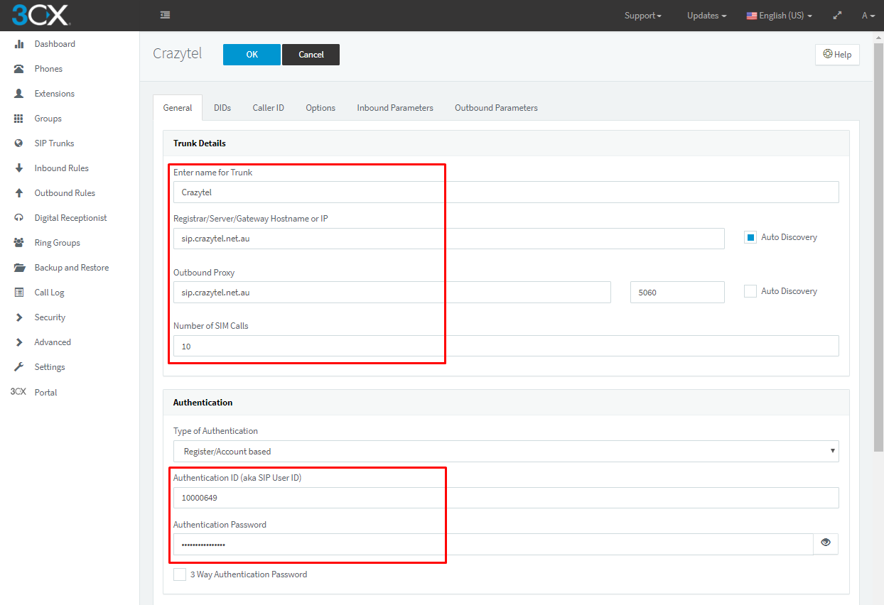 - Main Trunk No: This can be the DID you purchased through Crazytel