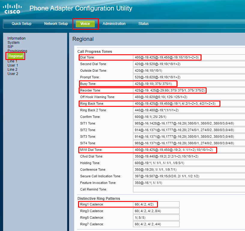 To update the dial tones select Voice from the top menu then click on Regional in the left hand menu. Then on the page enter the following details.