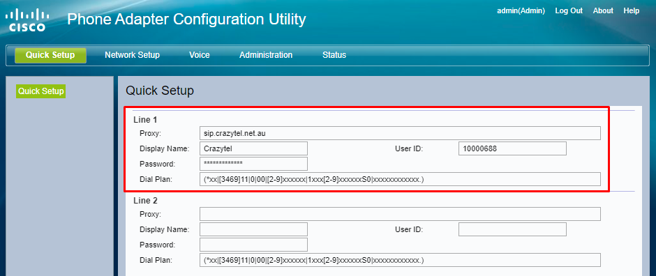 2. You will be taken to the Quick Setup page. Enter the following information into the corresponding Line your phone is plugged into.