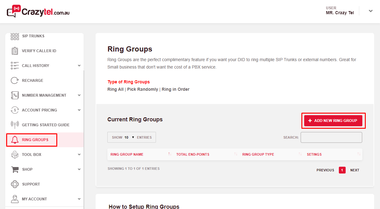 Ring Groups page in the left hand menu. When the page has loaded click on the Add New Ring Group button on the right.