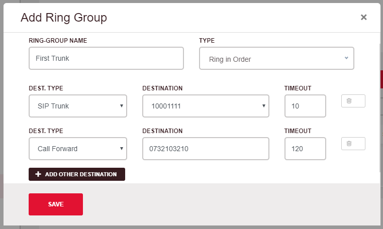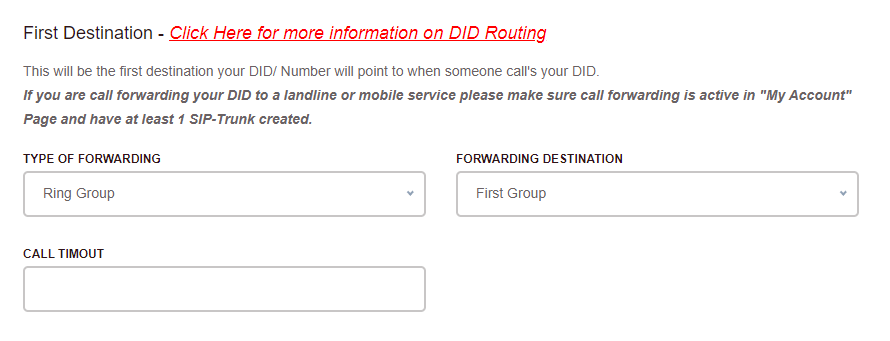 - - - Timeout: Enter a time in seconds for the call to go to the next number. This will only display if Ring in Order is selected as the Type. Please note that Timeout time on the last destination will cause the call to overflow to the Second Destination on the DID. If you do not have a secondary destination it will be best practice to make this timeout quiet high.