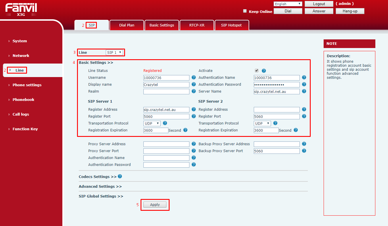 4. Enter the following details which you will receive when setting up the SIP Truck in the Crazytel Portal
