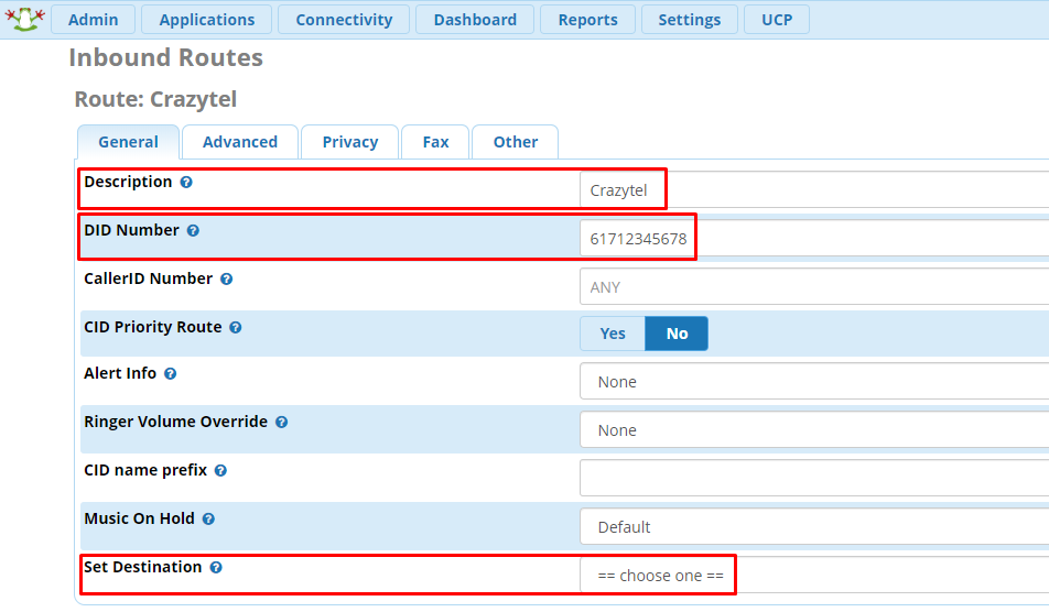 - DID Number: enter the number you purchased from the Crazytel Portal. Please make sure to put the DID in international format 61XXXXXXX.