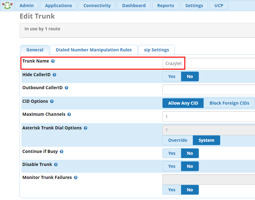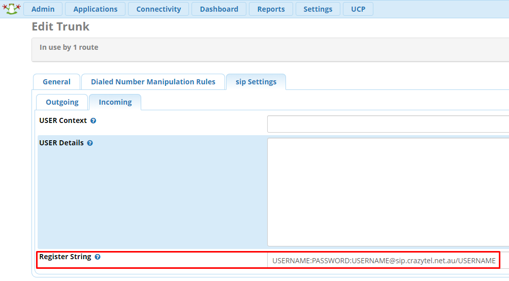 Register String. Make sure to update the username password and URL to be what Crazytel provided when setting up your SIP Trunk.