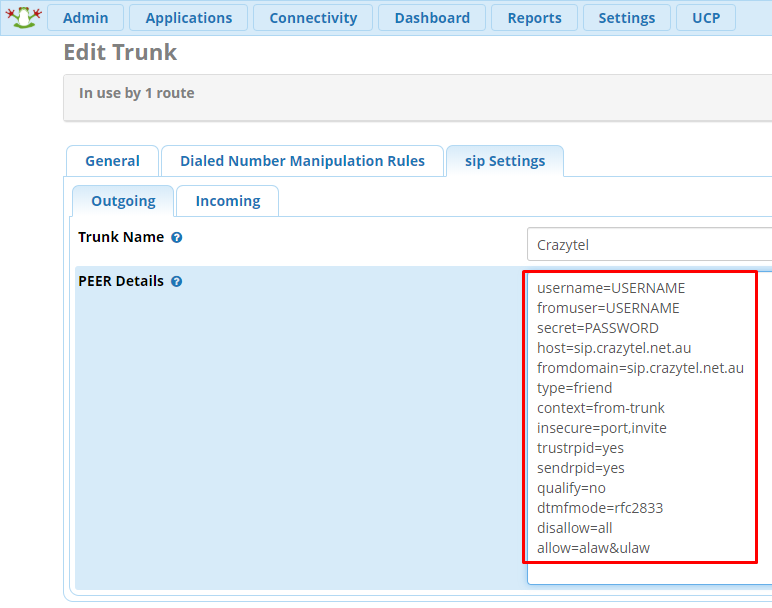 PEER Details text box. Make sure to update the username password and URL to be what Crazytel provided when setting up your SIP Trunk.