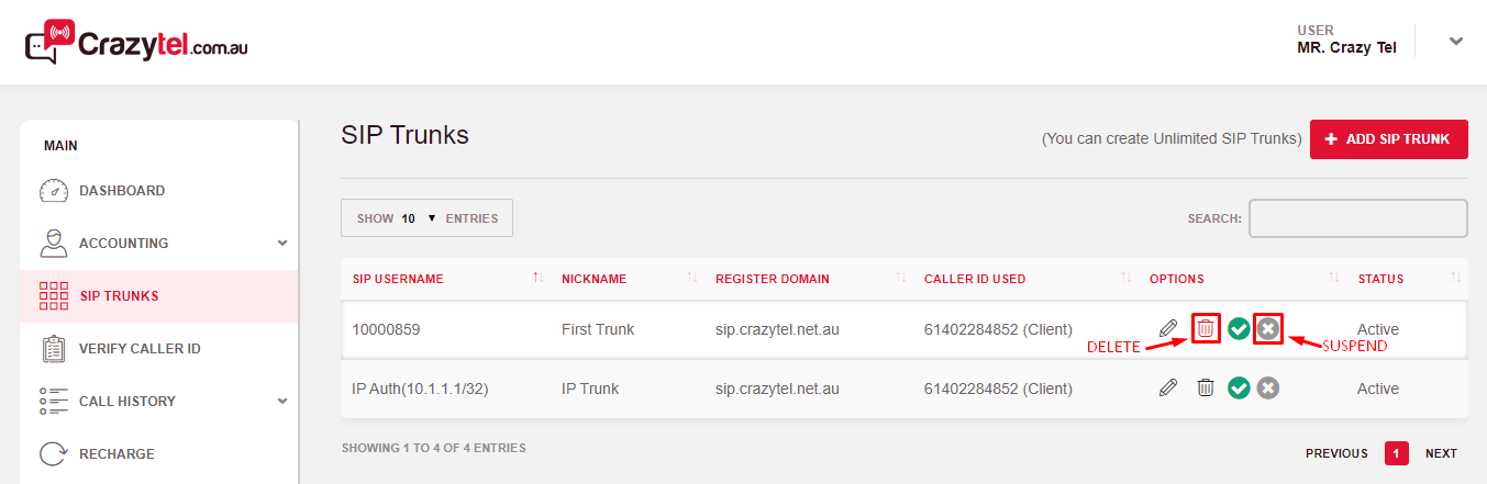 3. Locate the Trunk you wish to delete and click the
