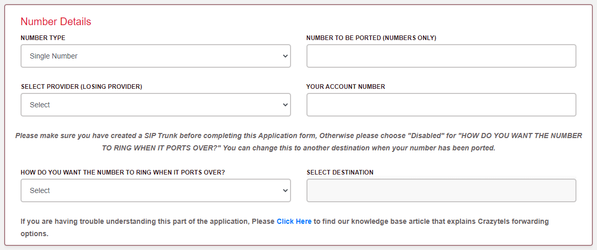 8. There are a number of ways Crazytel can deal with the calls that come through your number. Please make sure you have created a SIP Trunk before completing this Application form, Otherwise please choose "Disabled" for "How Do You Want The Number To Ring When It Ports Over?" You can change this to another destination when your number has been ported. You will be able to select from the following: