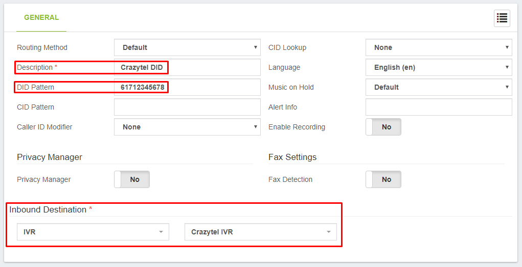 - DID Pattern: enter the number you purchased from the Crazytel Portal. Please make sure to put the DID in international format