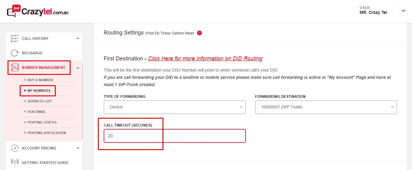 First Destination section. Enter the amount of time, in seconds, you wish for you phone to ring before going to voicemail.