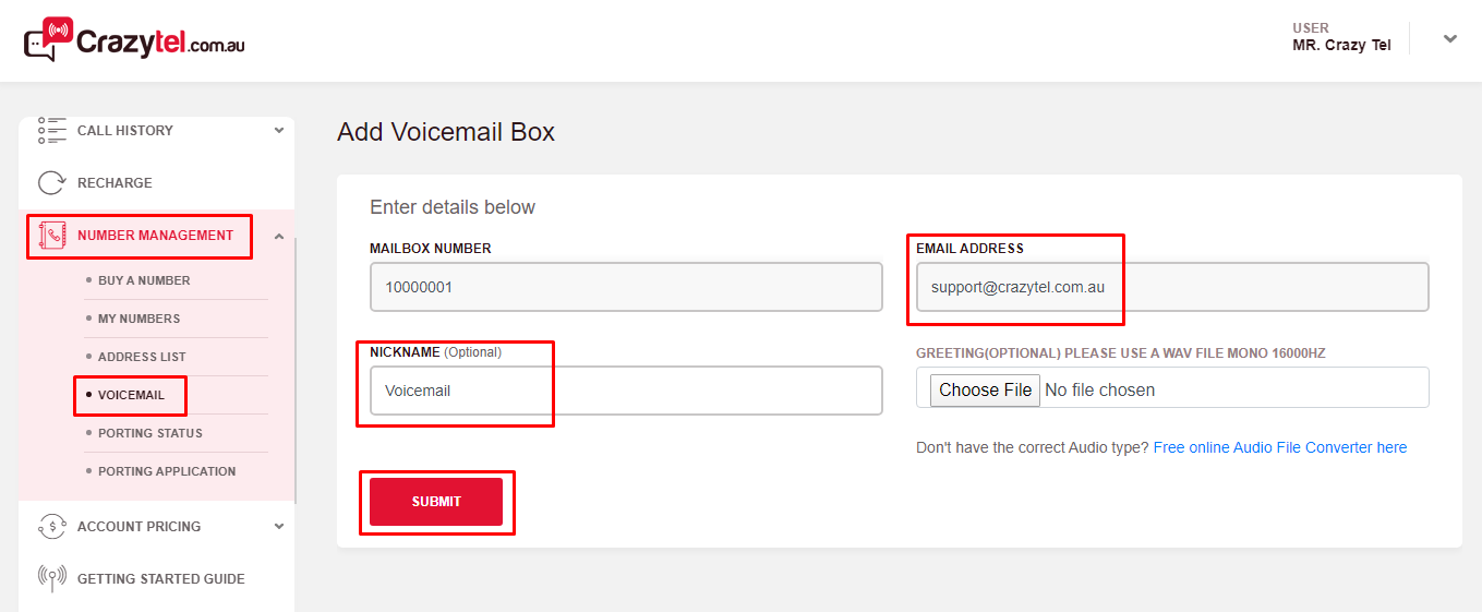 8. Once a voice mail has been left you will receive an email to the email address on your account.